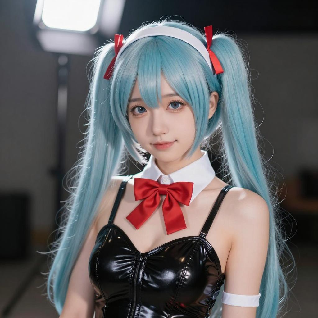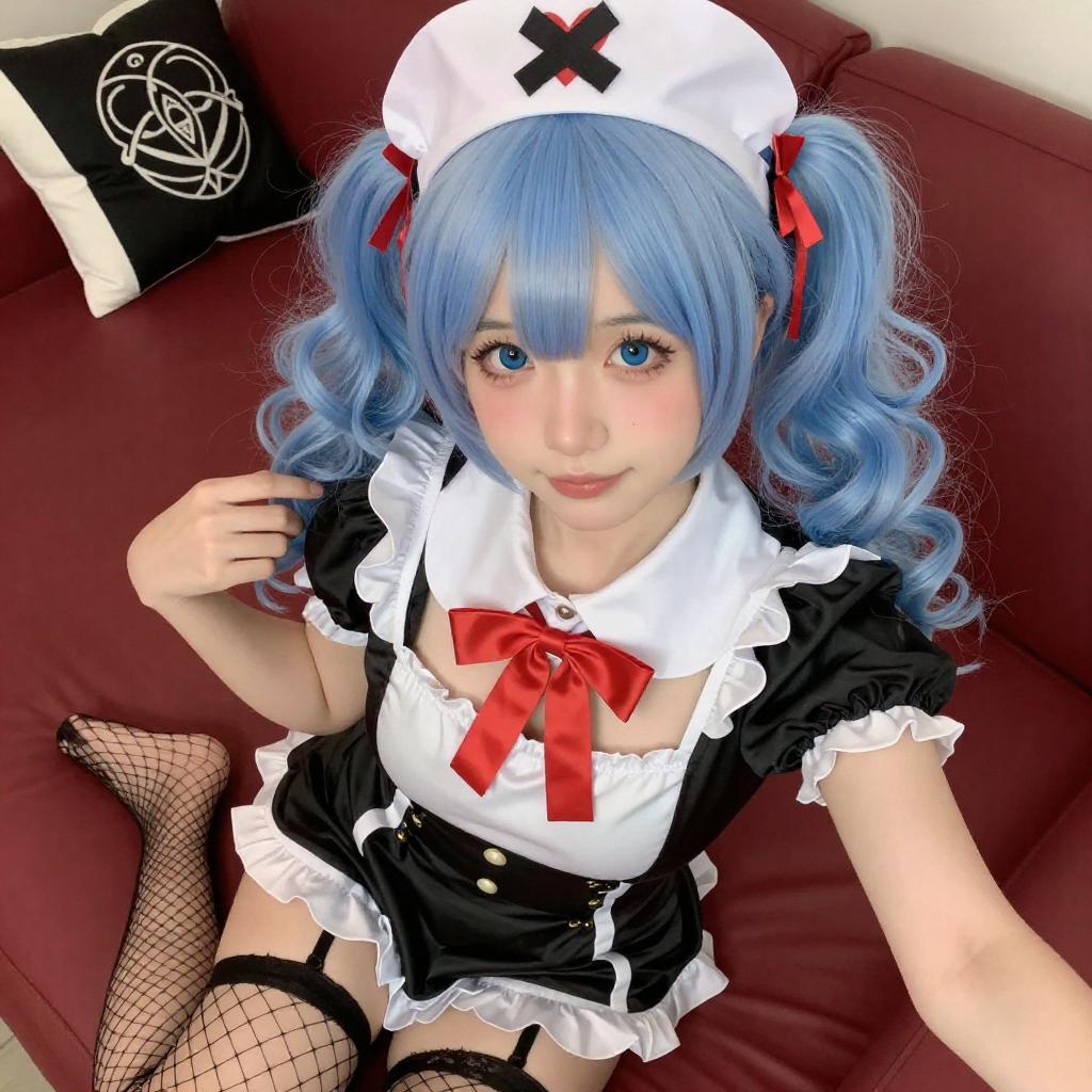 Photograph of an Asian woman with light blue, long twin-tails, wearing a black and white maid outfit with a frilled headband, black ribbon choker, and purple hair ties. She has fair skin, red lipstick, and a shy expression, with her hair partially covering one eye. The background is a simple indoor setting with a wooden door.