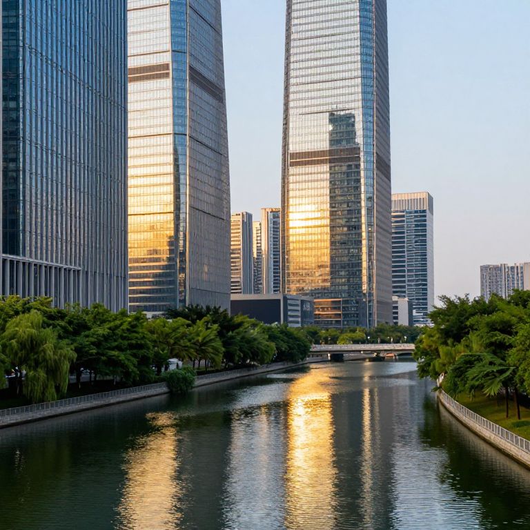 Sunlight cascades through towering glass skyscrapers, illuminating golden interiors and casting shimmering reflections on the tranquil waterway below, where lush greenery lines the edges of a futuristic urban landscape.