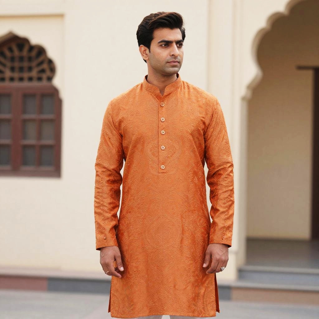 Simple Sherwani Costume, a man in an orange sherwani stands in front of a building