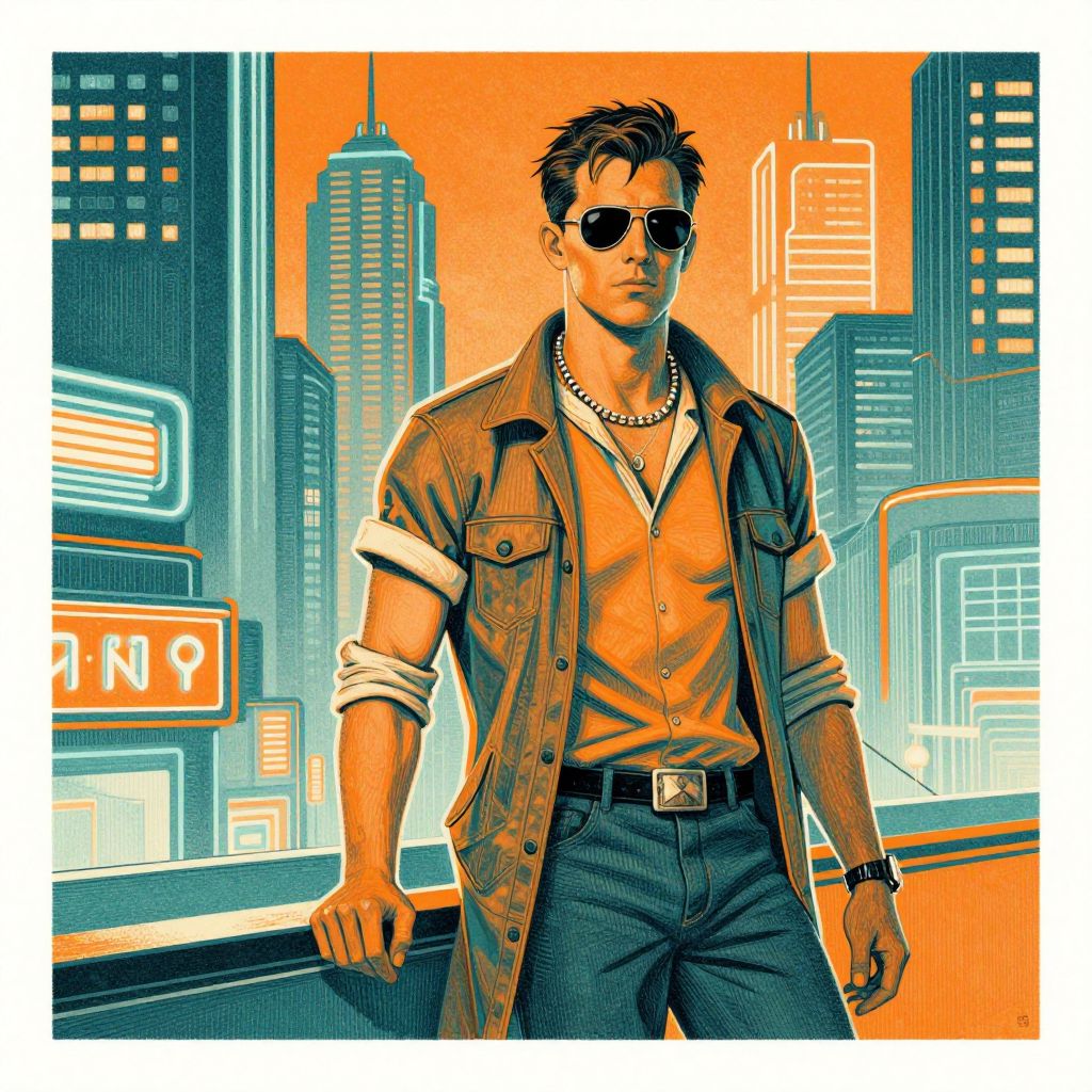 Digital illustration of a cool, dark-haired man in sunglasses, open shirt, chain necklace, and jeans, standing against a neon-lit cityscape.