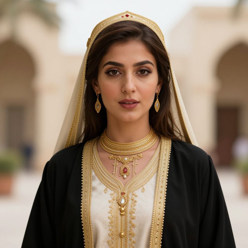 Masterpiece, best quality, highly detailed, ultra high res, (photorealistic:1.8), unreal_engine, photograph, realistic_skin_texture, 8K, HDR, raw photo, (Bahraini woman:1.8), solo, (national costume clothes), ultra face detailed, outdoors
