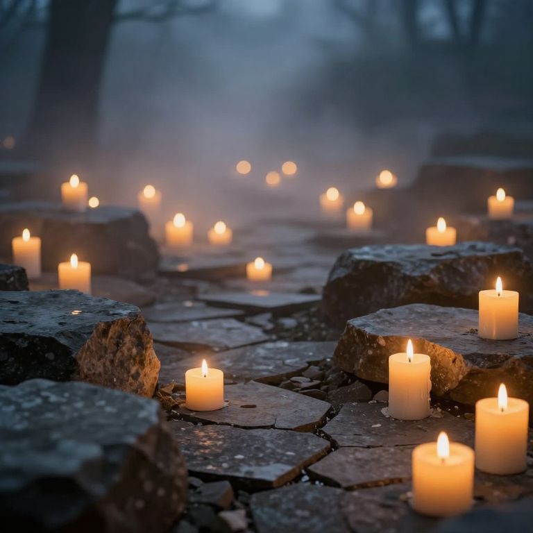 A serene tapestry of flickering candles emerges from fractured stone, their golden flames casting whispers of remembrance and hope into the cool, misty air, where the weight of memory and the warmth of renewal intertwine.