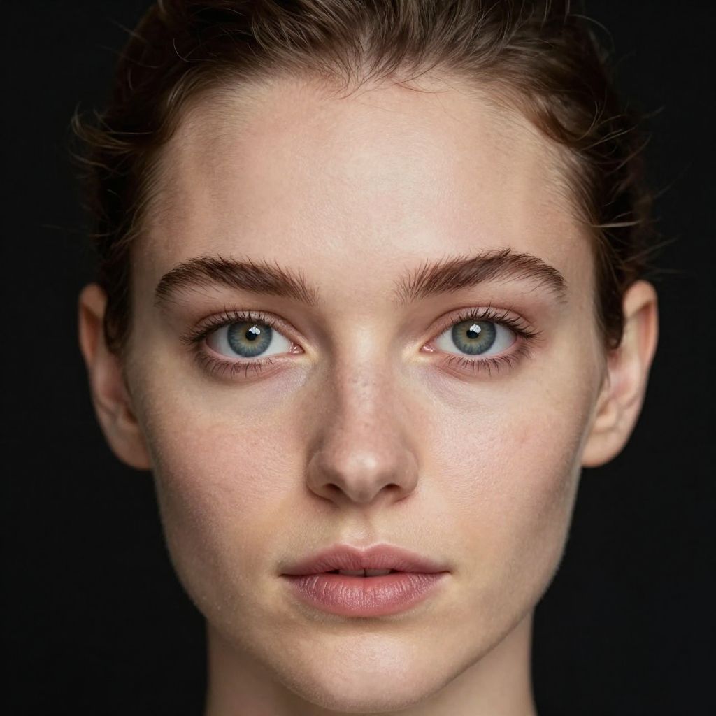 Portrait close-up of a young Caucasian woman with blue eyes and natural skin texture against a plain black background. The image features clean, high-contrast lighting highlighting her facial features, including clear skin pores, well-defined eyebrows, and natural lips. The woman's hair is pulled back, and her expression is neutral with wide-open eyes, emphasizing the detailed and photorealistic quality of the image.
