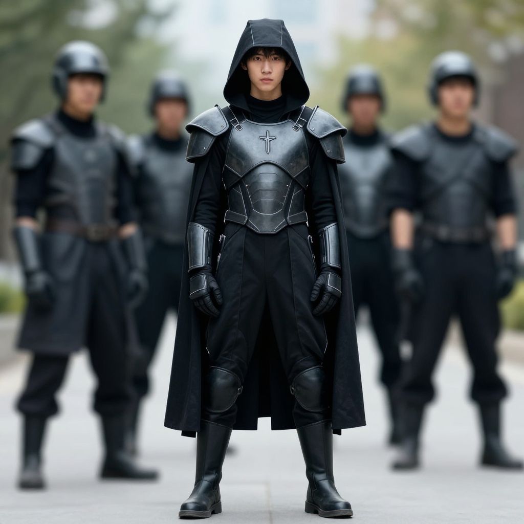 Photograph of a young person in medieval-inspired black armor standing center-frame. They wear a hooded cloak, silver shoulder armor, and black leather gloves and boots. A cross is visible on their chest plate. Four blurred, similarly dressed individuals stand in the background, slightly out of focus. The scene is outdoors, with greenery and a bright sky in the background. The armor and clothing have a sleek, polished texture. The overall style blends medieval and modern elements, with a focus on dark, contrasting colors. The young person's expression is neutral, and their gaze is directed forward.