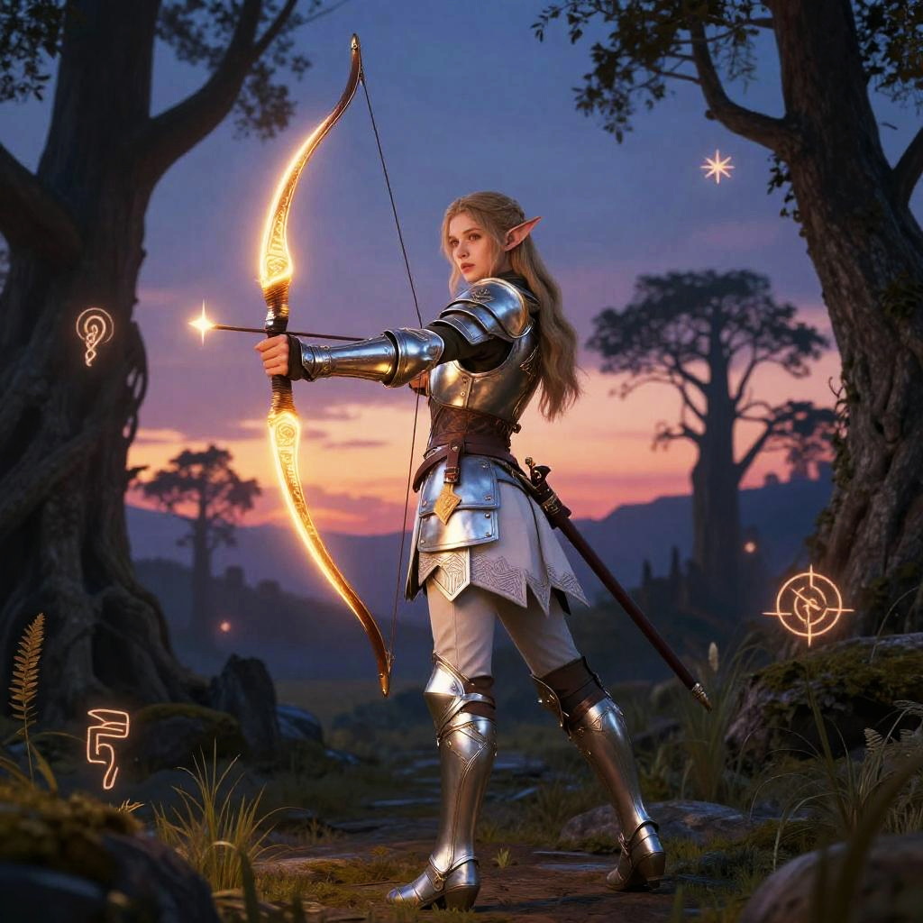 Fantasy elf art of a warrior elf in elegant armor, wielding a glowing bow under a twilight sky, surrounded by ancient trees and floating magical runes, highly detailed, vivid colors, dramatic lighting, epic fantasy scene.