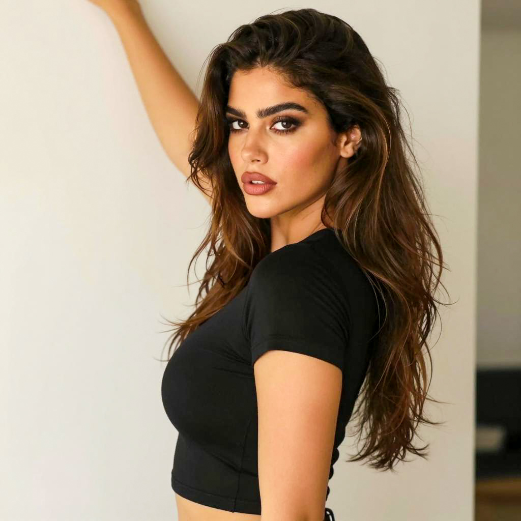 Portrait of a woman with long, wavy brown hair, wearing a sleeveless beige knee-length dress, leaning on a black metal railing on a balcony. The background features a brick building with windows and metal fire escape elements, giving an urban city setting. The woman looks directly at the camera with a confident, intense expression.