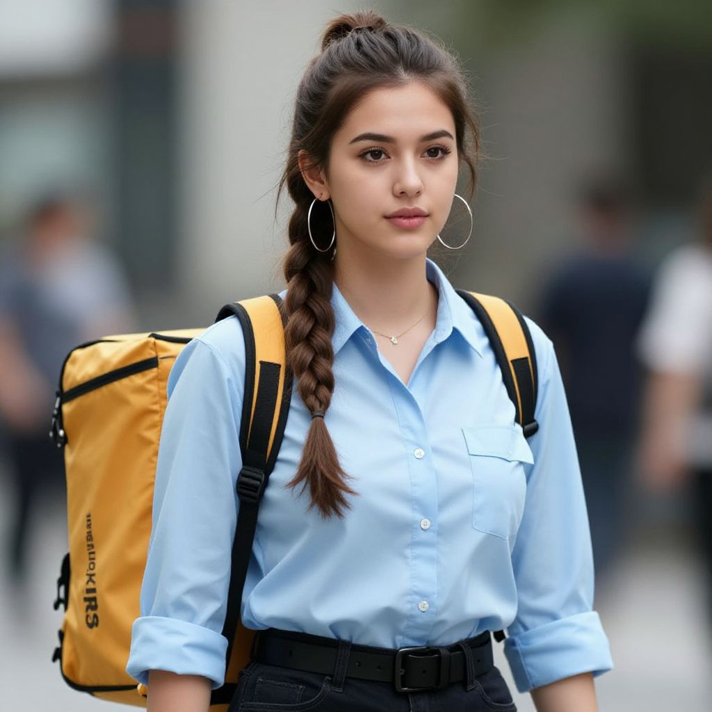Photograph of a young woman with medium-light brown skin and long, straight black hair. She wears a black wide-brimmed hat, a white short-sleeved button-up shirt, and black suspenders. Her facial features include dark, arched eyebrows, large brown eyes, and full lips with light pink lipstick. She also has small silver hoop earrings. The background is blurred, showing an urban setting with indistinct people and buildings. The image has a soft, natural light, emphasizing her serene expression and chic, modern style.