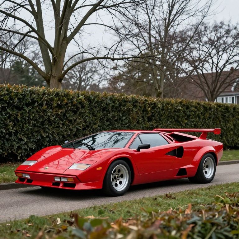 Lamborghini Countach 5000 QV replica, painted in vibrant red, is parked gracefully beside a neatly trimmed hedge, showcasing its iconic design and rear spoiler against a backdrop of leafless trees and overcast skies.