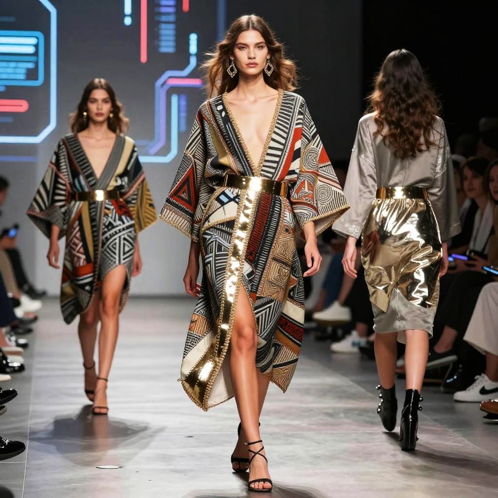 A futuristic fashion runway featuring ropas with bold geometric patterns and metallic accents, models in avant-garde styles walking under dynamic lighting, sleek urban background with holographic displays, emphasizing innovation and style.