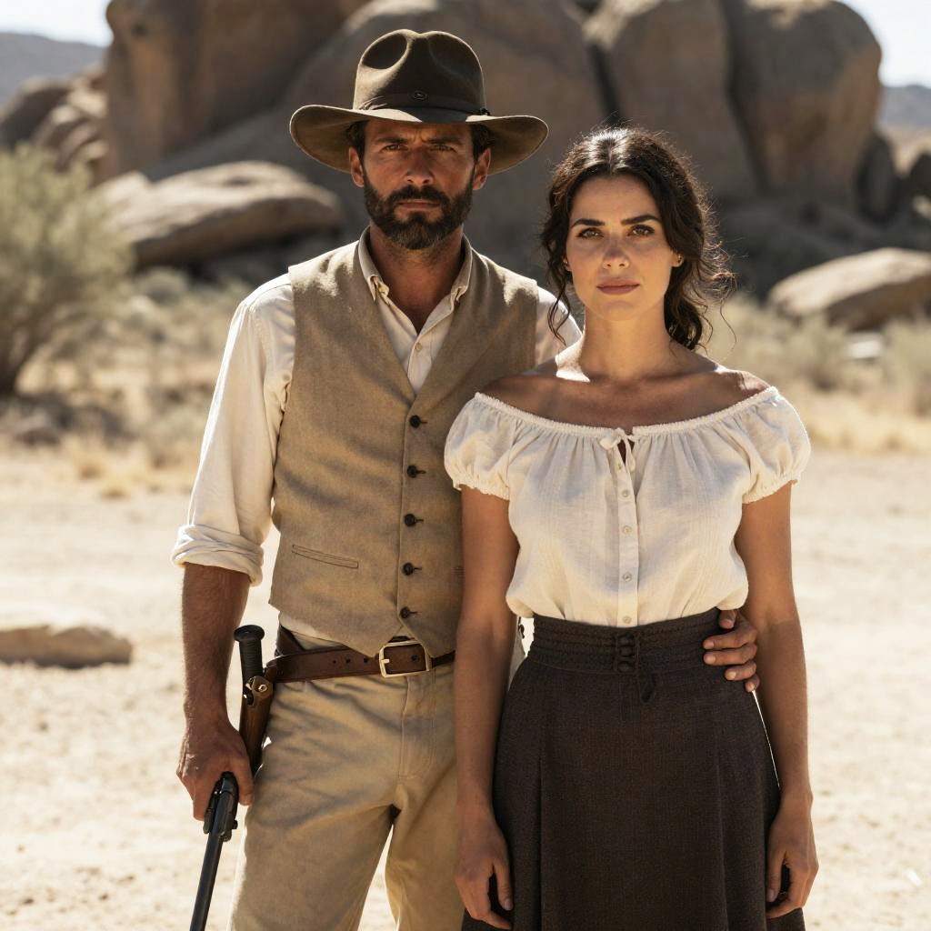 Black and white photograph of a man and woman standing outdoors. Man with beard, wearing cowboy hat, vest, and gun belt, holds a gun in his right hand. Woman with short dark hair, white blouse, and patterned skirt, stands in front of him with a serious expression. Rocky landscape in background. Man's left arm around woman's shoulders. Both looking slightly to the right.