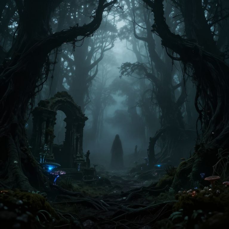 Mysterious, dark forest scene with twisted trees, glowing blue lights, ancient ruined arches, and a shadowy figure in the foggy distance.