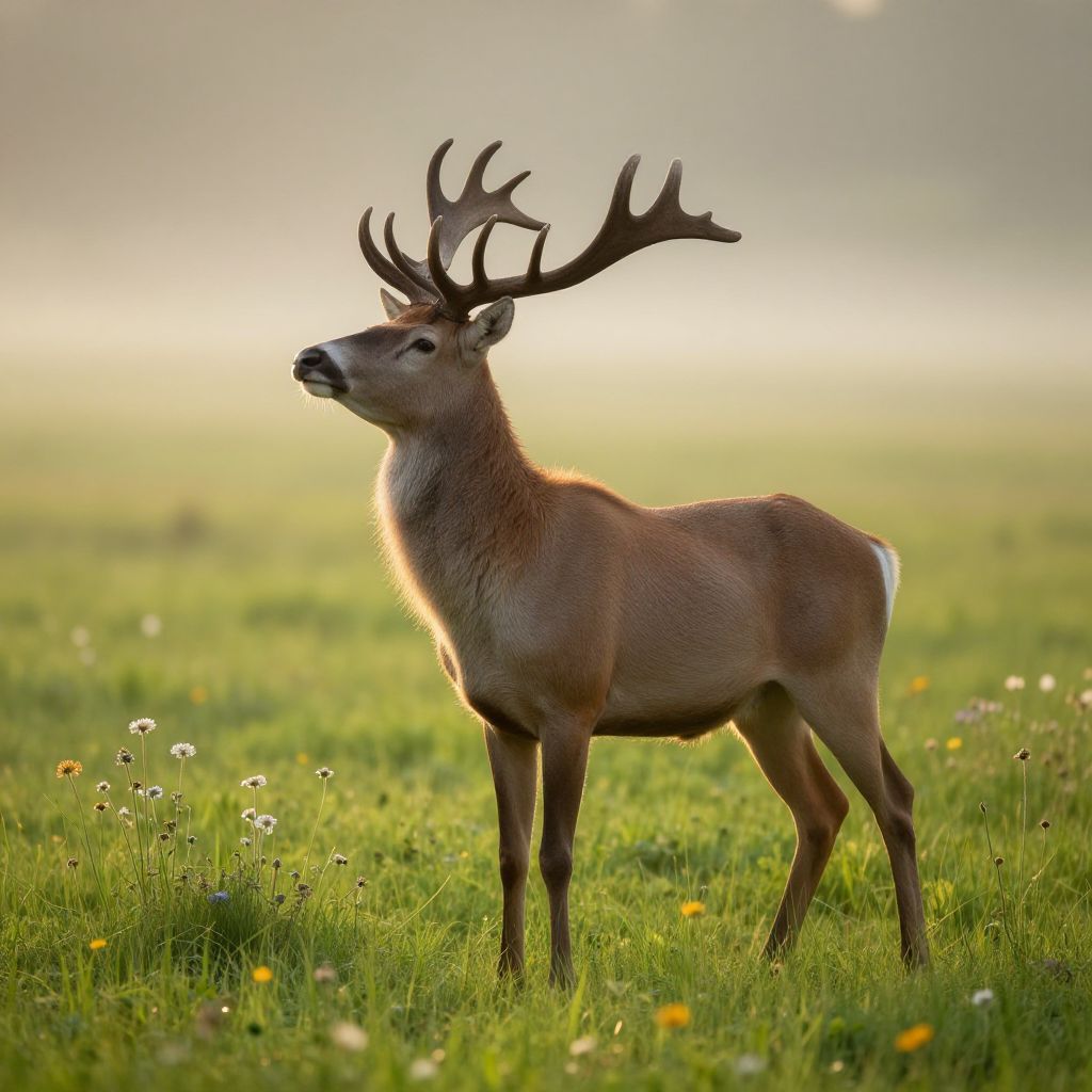 Lingyang standing gracefully in a lush green meadow at dawn, delicate fur glowing softly under the morning light, elegant antlers reaching towards the sky, surrounded by blooming wildflowers and gentle mist, hyper-realistic nature scene with a tranquil atmosphere.