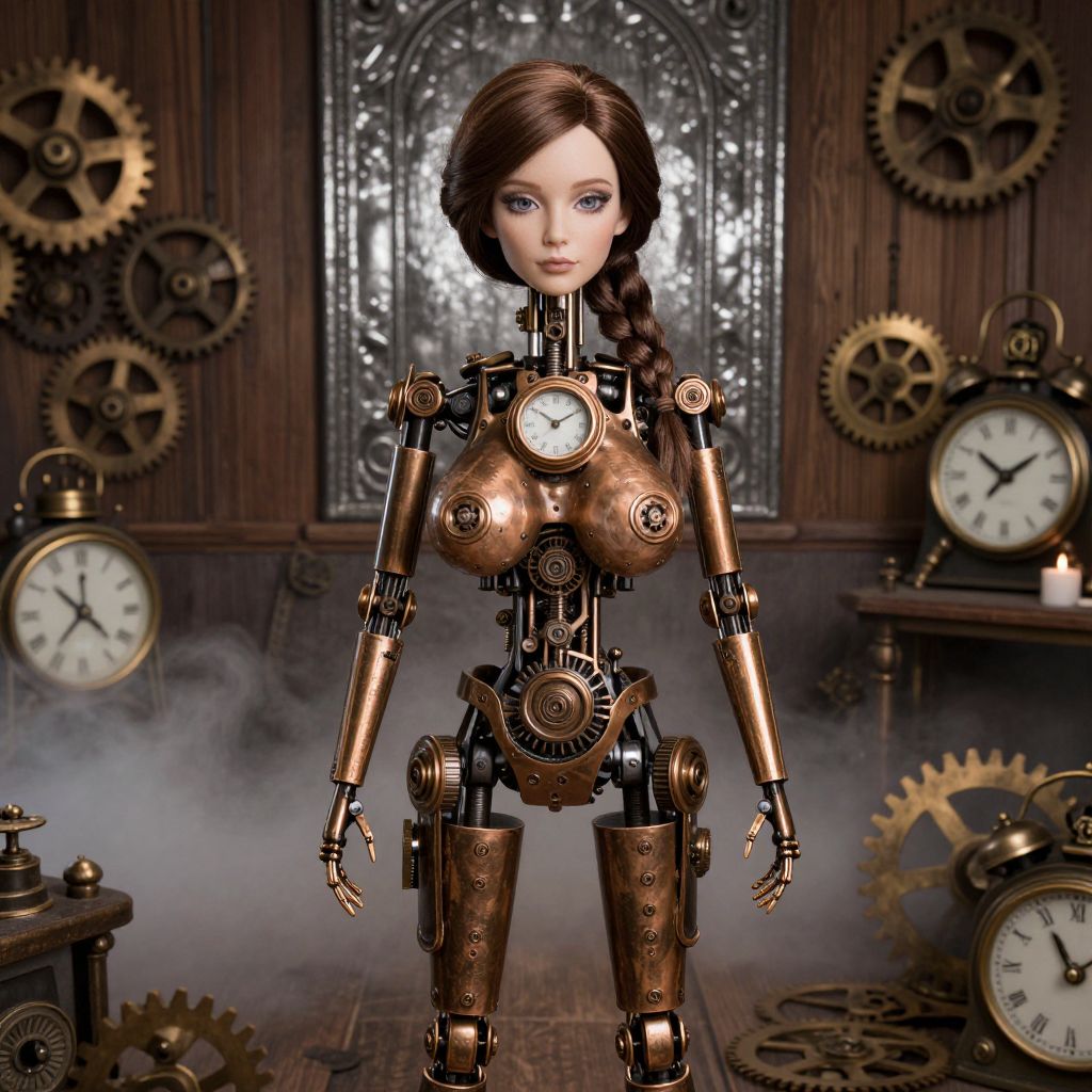 Photorealistic CGI of a female clockwork robot with copper gears, blue eyes, and brown hair in a braid, standing in a steamp