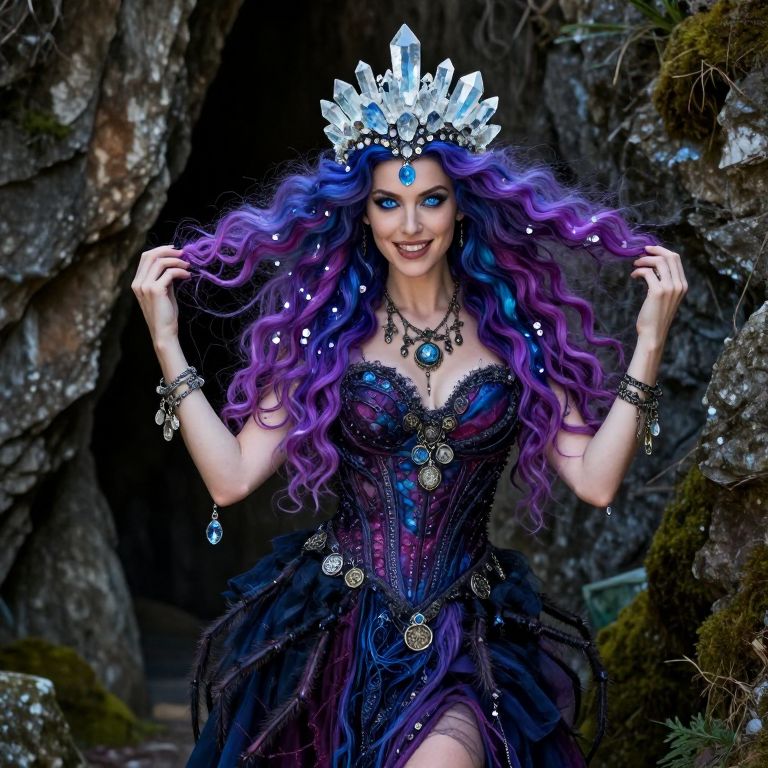 In this captivating full-body portrait, Fridha, the enigmatic witch, exudes an air of mystery and power. Her eyes, a mesmerizing shade of deep blue, sparkle with the light of distant stars, reflecting her connection to the celestial. Her hair, constantly changing in color and texture, dances around her head, adorned with shimmering crystals that seem to glow with an inner light. Dangling from her wrists and adorning her neck are various trinkets, charms, and amulets, each telling a story of her many journeys and love for unique and expressive fashion. She is clad in a gown woven from the silk of otherworldly spiders, its intricate patterns and textures hinting at the realms she has visited. The headdress she wears is adorned with shimmering crystals, adding to her ethereal presence. Her confident yet playful demeanor is evident in her graceful posture and mischievous smile, suggesting a wealth of knowledge and power, yet an unpredictable and dangerous side. The air around her is infused with a unique fragrance that evokes the essence of the realms she has visited, creating a sense of intrigue and wonder. The background, a home tucked in among the cliffs, provides a stark contrast to the vibrant and colorful elements of her attire, highlighting the intricate details of her clothing and accessories. The volumetric lighting and hyper-detailed textures of her attire and accessories create a sense of depth and realism, making her appear almost tangible. The overall composition is balanced, with Fridha as the central figure, surrounded by the various elements that contribute to her enigmatic and powerful presence.