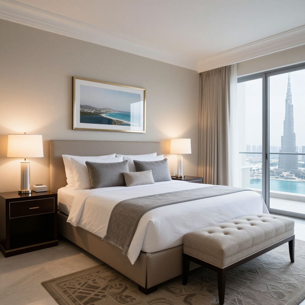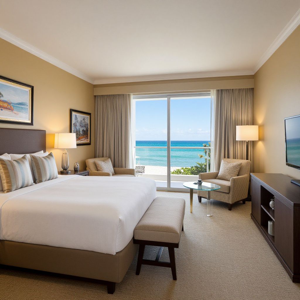 One Bed Suite at Trump International Beach Resort in Sunny Isles Beach, FL, featuring a luxurious king-sized bed with white linens and striped pillows, flanked by two bedside lamps, overlooking a serene ocean view through floor-to-ceiling windows draped with beige curtains, complemented by a cozy seating area with armchairs and a glass coffee table, all set against warm beige walls and accented by elegant decor including framed artwork and a wooden bench at the foot of the bed.