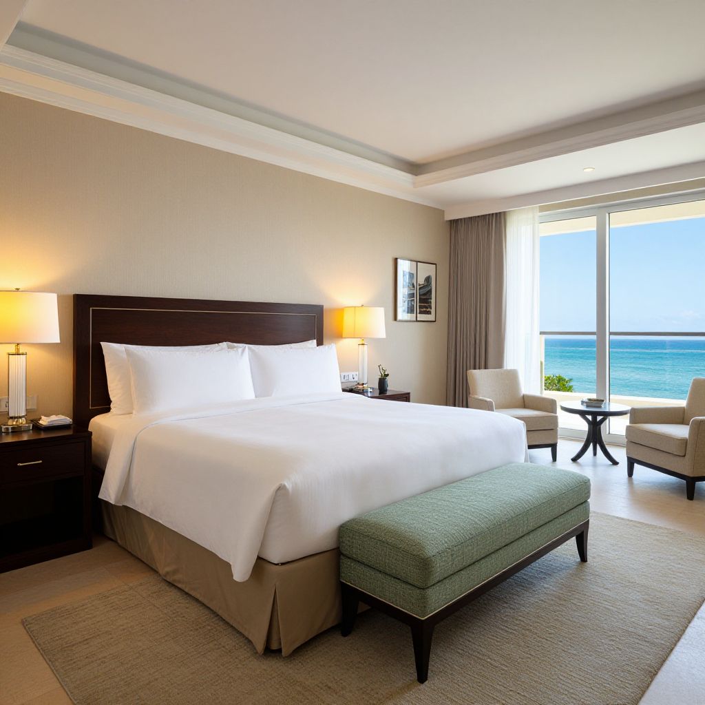 Photograph of a modern beach-view hotel room with a large bed, two armchairs, a glass-top table, and ocean view through sliding doors