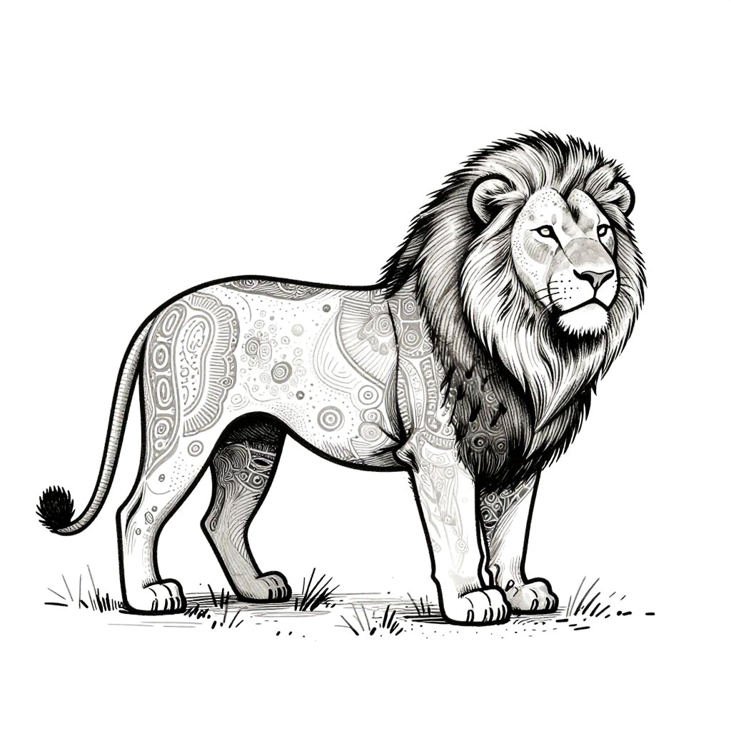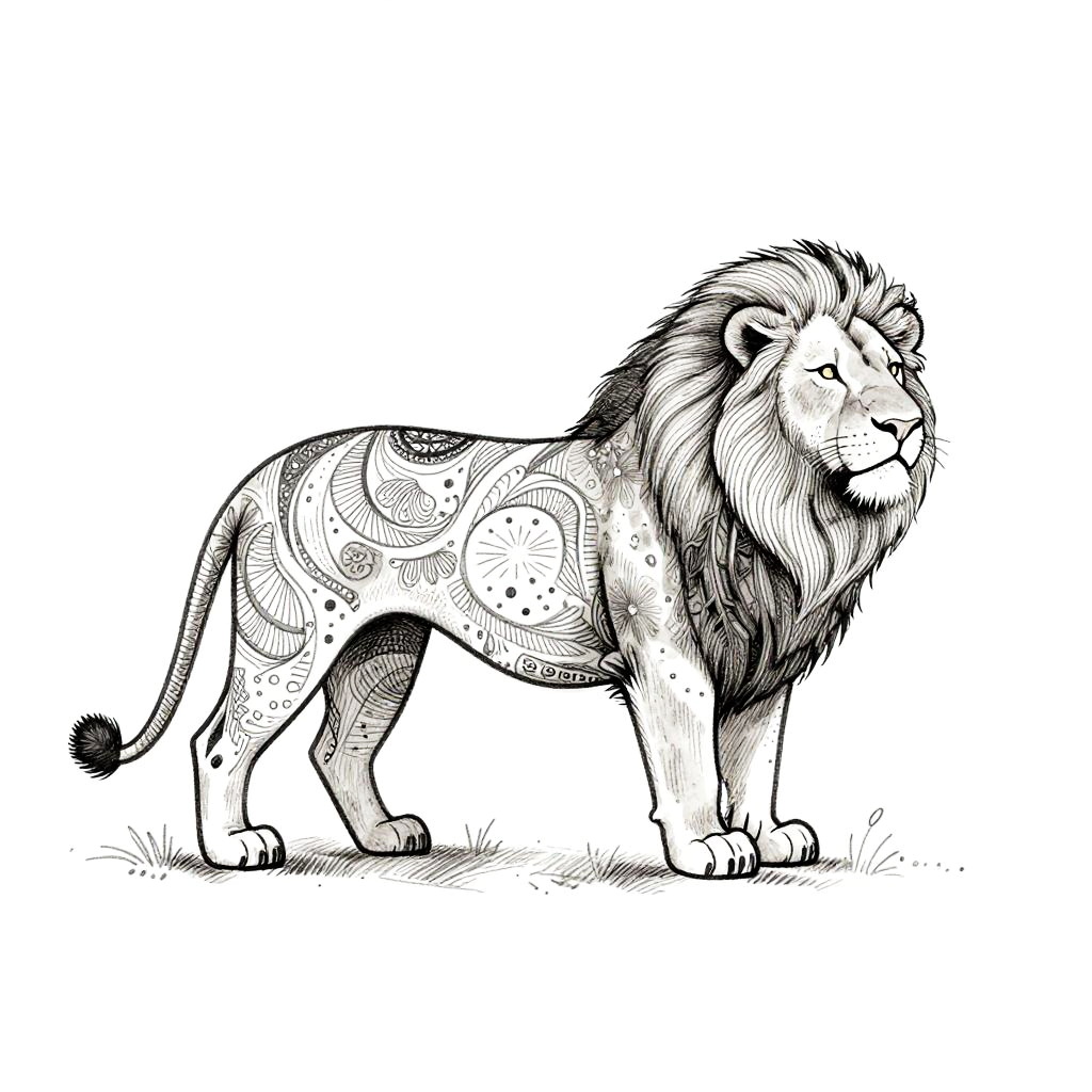 Landscape painting of a hand-drawn illustration of a lion, in a minimalistic style with intricate details, monochrome patterns on a white background, high quality.