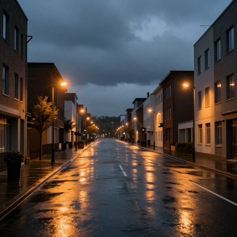 Photograph of a deserted, wet street at dusk, lined with illuminated buildings, reflecting orange streetlights on a glossy road. Dark, cloudy sky in