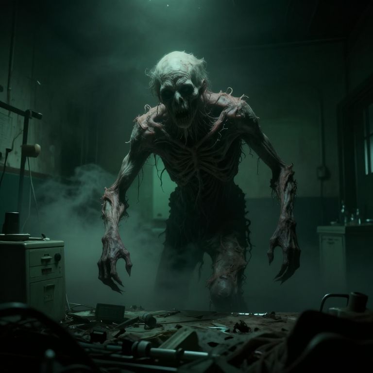 Digital artwork of a terrifying, skeletal, humanoid monster with hanging flesh, standing in a dark, foggy, cluttered laboratory. Greenish lighting enhances
