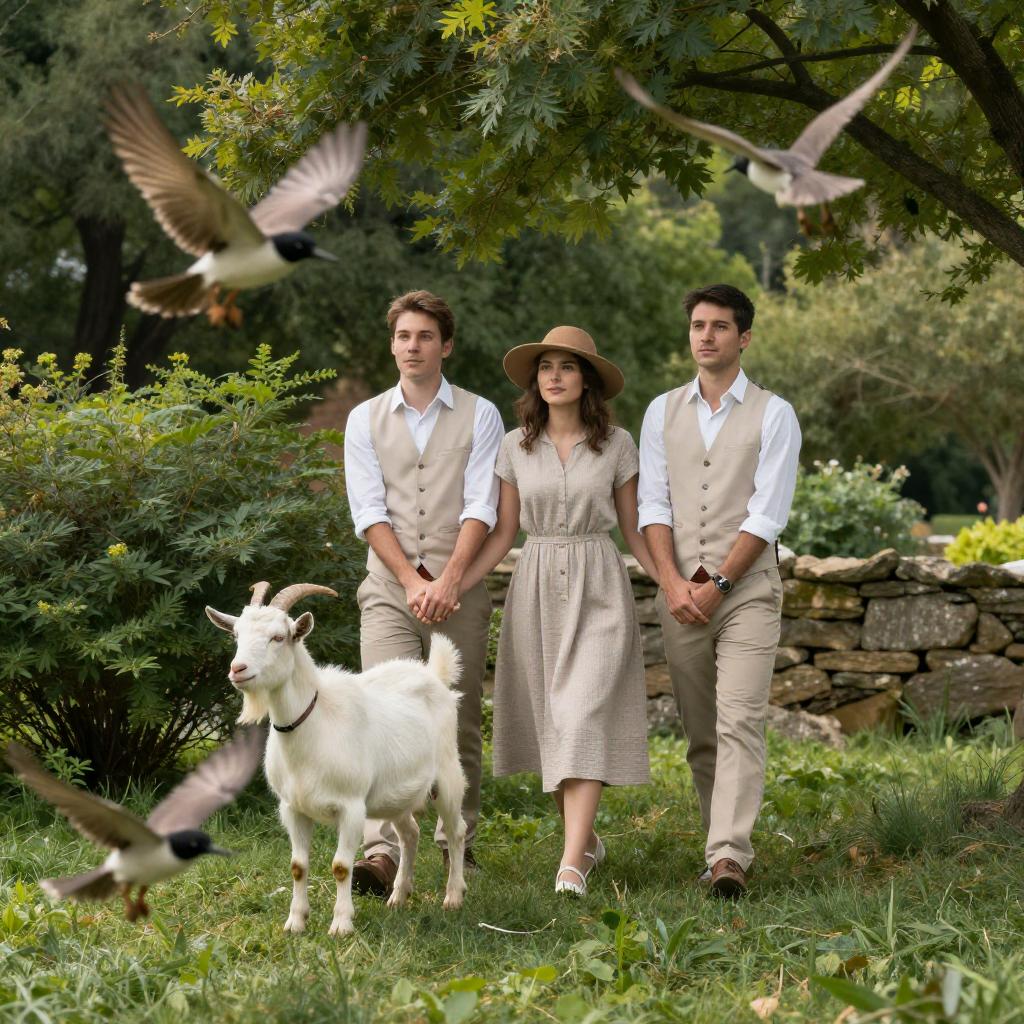 Photograph of three people and animals in a lush garden. Two men in white shirts and vests, one holding a book, pull a woman in a beige dress and brown hat. A white goat and two birds in flight are in the foreground. Vivid green foliage and a stone wall in the background. The woman looks forward, men look to the side. Birds' wings are spread. Sunlight filters through leaves.