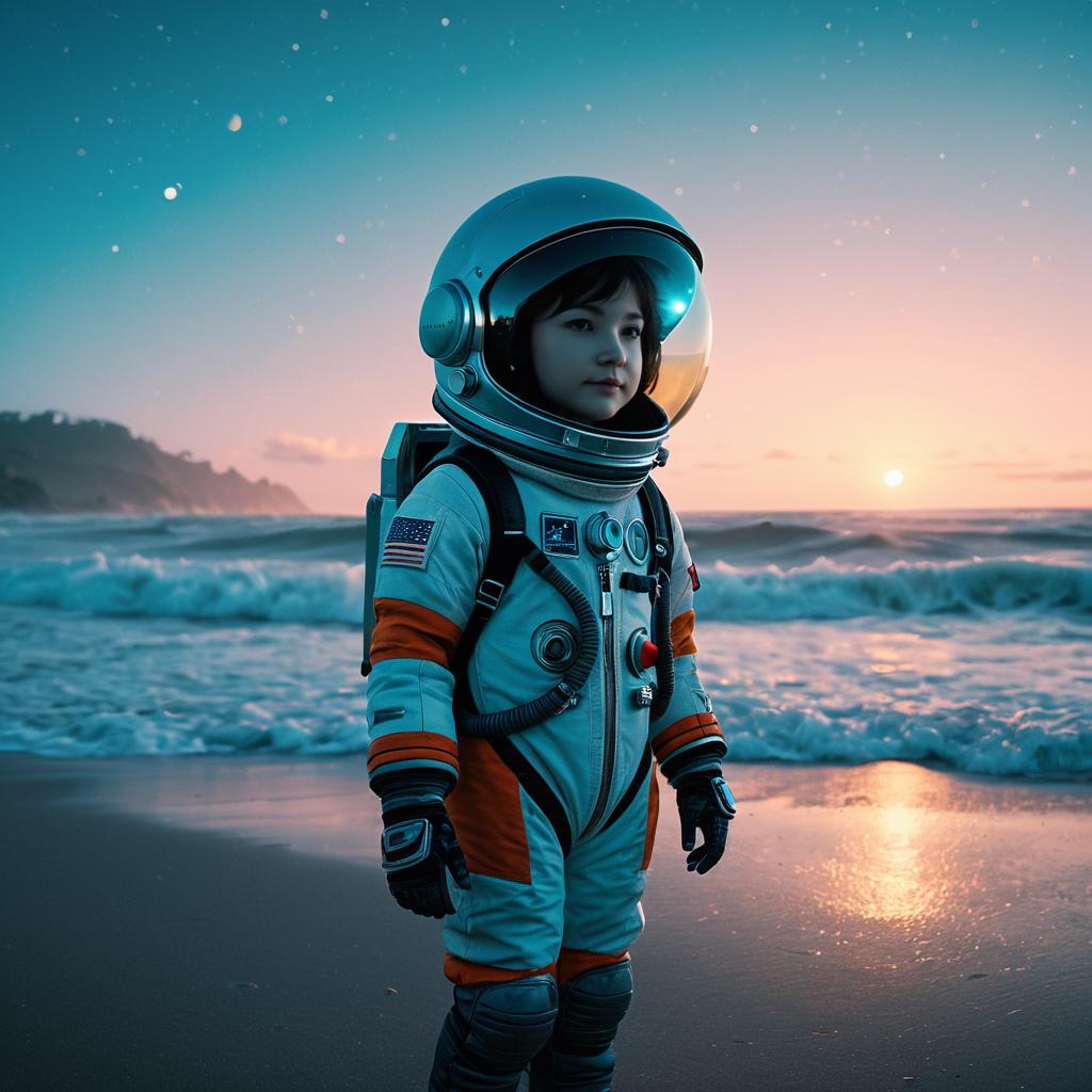 A hyper-realistic portrait of an astronaut child with a mesmerizing astronaut helmet in a ombre twilight beach with gently rolling bioluminescent waves, cinematic volumetric lighting, photorealistic detail, vivid color glow, fog volumes, rendered in Unreal Engine and Octane, art by Beeple intersects with Studio Ghibli, masterpiece, award-winning