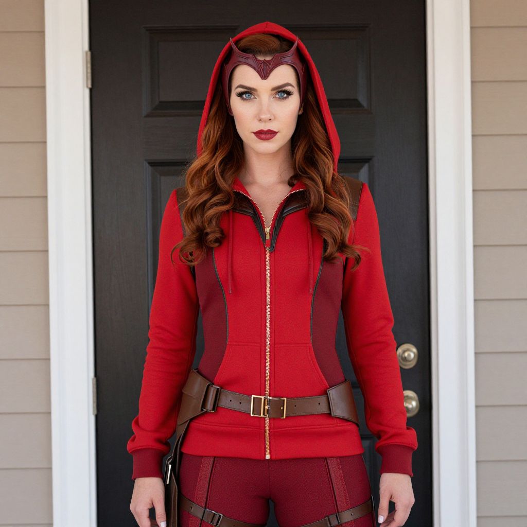 Scarlet Witch Closet Costume, woman in red hoodedie standing in front of a door