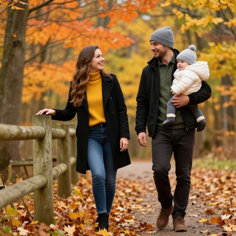 Photograph of a smiling Caucasian family walking on a forest path during autumn. The mother, with long brown hair, wears a yellow turtleneck, black coat, and blue jeans, leaning on a wooden fence. The father, with a beard and grey beanie, wears a black jacket and dark pants, carrying a bundled-up baby in a white coat and grey hat. The background features vibrant orange and yellow leaves on trees. The path is covered in fallen leaves, creating a warm, textured carpet. The family is centered, with the father to the right and mother to the left, both looking at each other happily.