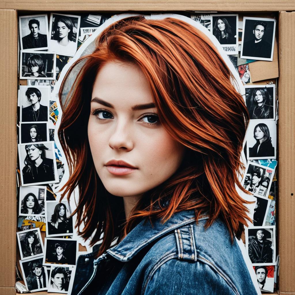 Young adult, with auburn hair, in the style of multi-layered collages, edgy street art, celebrity-portraits, cardboard, fragmented icons, realistic hyper-detail, crossed colors