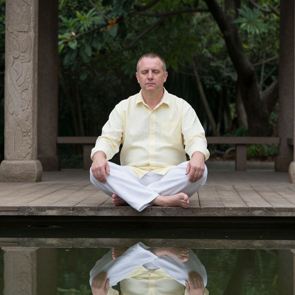 A photo of a middle-aged man with short hair, fair skin, and a slight build, sitting cross-legged on a wooden platform over a reflective pond. He's wearing a light yellow shirt and white pants, with a calm expression. The background is lush with green trees and carved stone pillars. The reflection in the water mirrors his serene pose. The image has a peaceful, meditative vibe.
