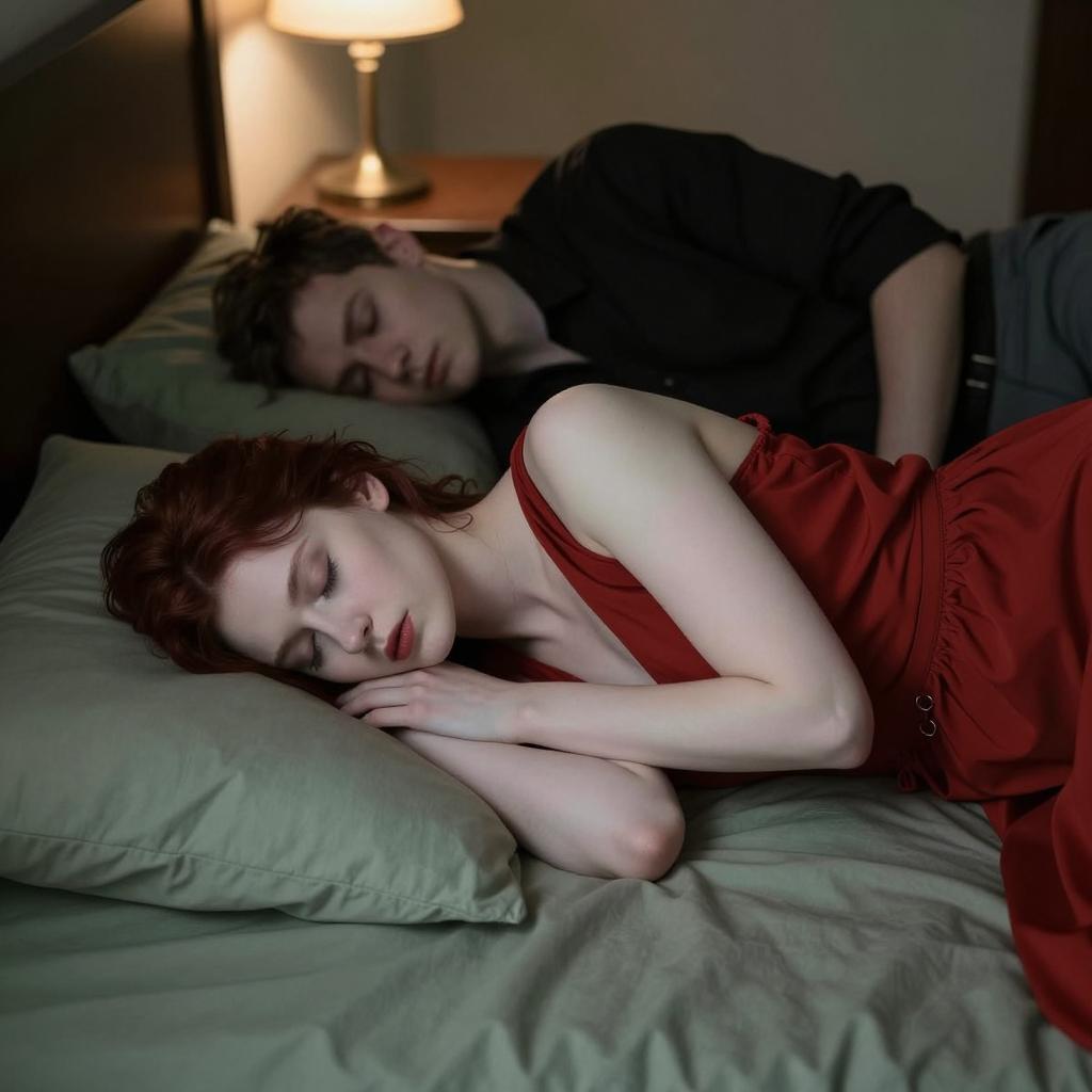 A dimly lit stairway. Red-haired woman in red dress leans against wall, left. Shirtless man with pale skin and dark pants stands in doorway, right. Closed green door behind man. Brick and floral wallpaper on walls. Light from below illuminates lower part of stairway.