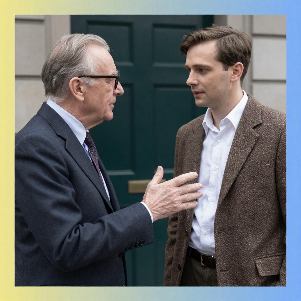 Photograph of two men in a mid-20th century setting. An older man with gray hair, glasses, and a dark suit gestures with his right hand, while a younger man with brown hair, wearing a brown tweed jacket and white shirt, listens intently. The background shows a green door. The image has a yellow and blue color gradient border with on the left.