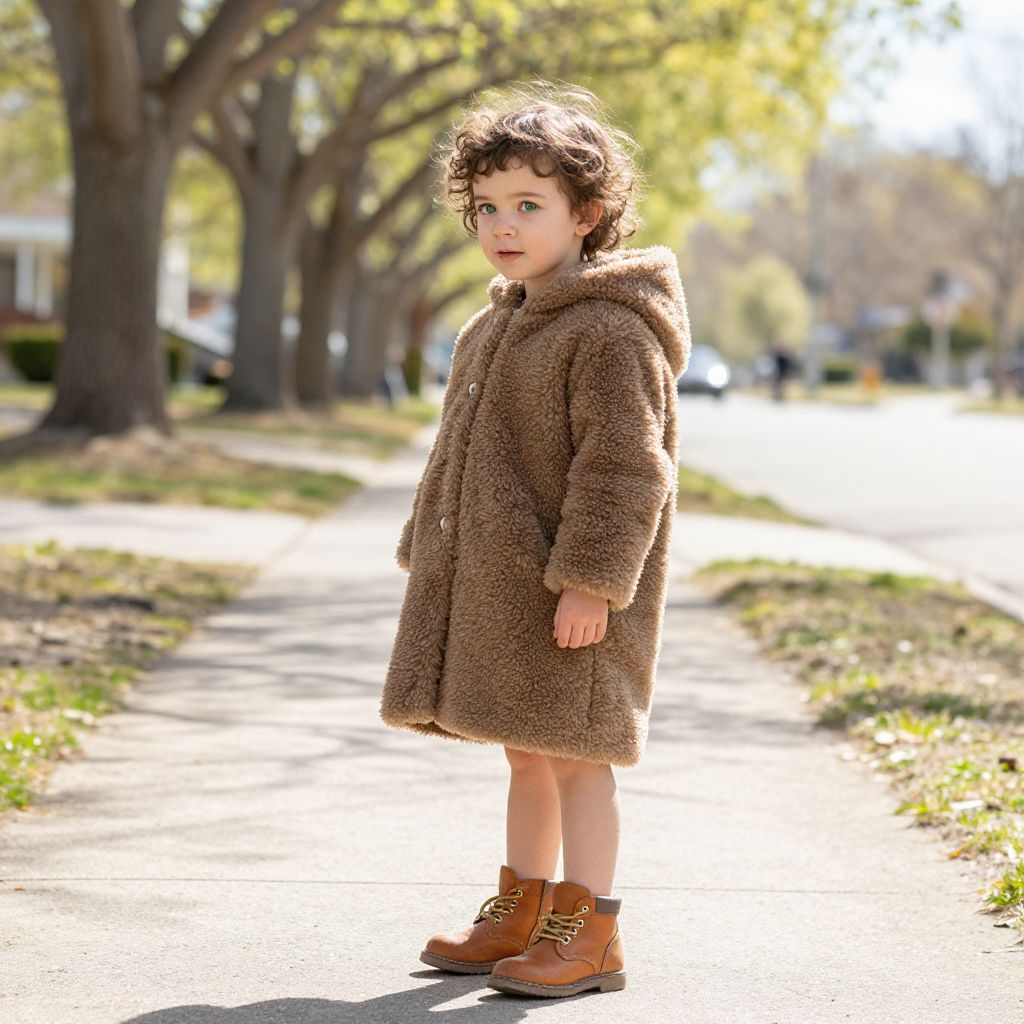 A young child, around 5 years old, with curly brown hair and bright green eyes, is wearing a brown furry coat with a hood that is slightly pulled up, and brown leather boots with small laces. The child is standing still on a sunny sidewalk, facing slightly to the left, with soft sunlight filtering through the trees in the background. The trees are tall and have leafy canopies, creating a gentle shadow beneath the child. The scene is set in a quiet suburban neighborhood during early spring, with a warm, natural atmosphere, and a subtle sense of innocence and curiosity in the child's expression.