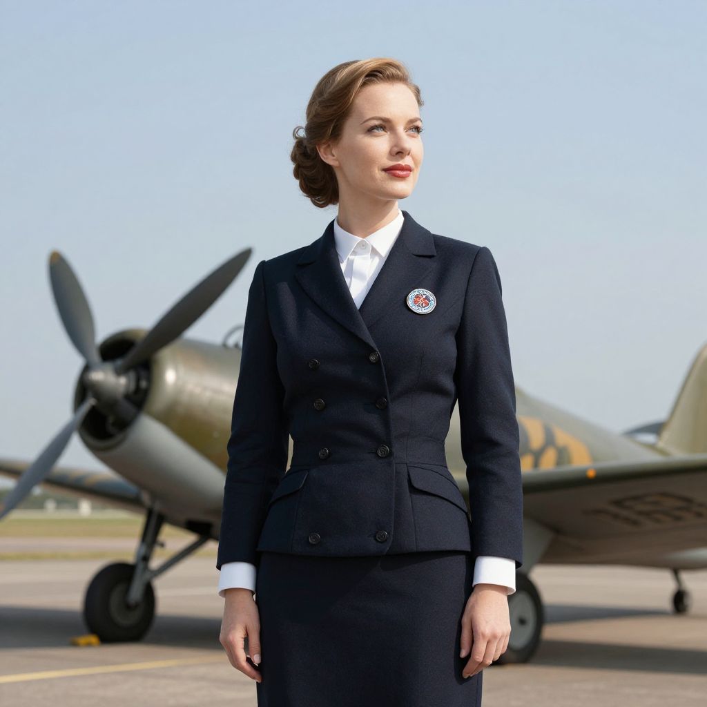 Photograph of a fair-skinned woman with brown hair in an elegant, vintage-style updo, standing confidently in front of a vintage propeller aircraft. She wears a black, double-breasted pilot's uniform with a white shirt and a round, red and white pilot's badge on the left breast. The background shows a clear blue sky and an airport tarmac. The aircraft, slightly out of focus, has a green and yellow camouflage paint scheme and is positioned to the left, with its black propeller and nose visible. The woman's expression is composed and professional.