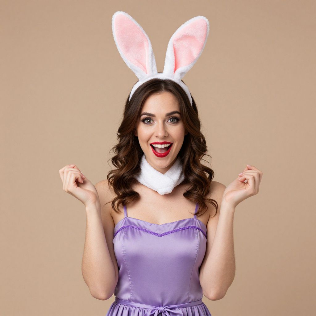 Photograph of a young woman with fair skin and dark brown, wavy hair smiling broadly with red lipstick. She wears a light purple, satin camisole dress with a ruffled neckline, and a white, fluffy bunny ear headband with pink inner ears. She also has a white, furry collar around her neck. Her hands are raised with fingers slightly curled, mimicking a playful pose. The background is a solid, light beige color. The image has a bright, cheerful, and slightly whimsical feel, emphasizing playful and cute elements.