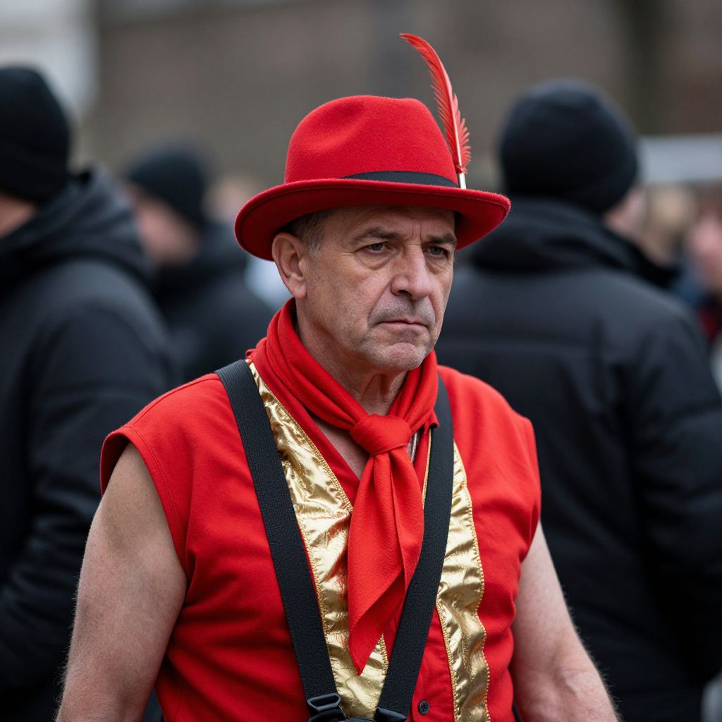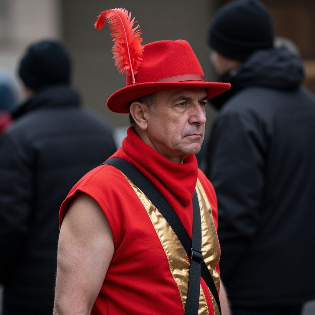 Photograph of a middle-aged man with a serious expression, wearing a bright red hat with a red feather, a red and gold sleeveless shirt, and a red scarf. He has a black shoulder bag. The background is blurred, showing several people in black winter clothing. The man's outfit stands out vividly against the more muted, darker surroundings.