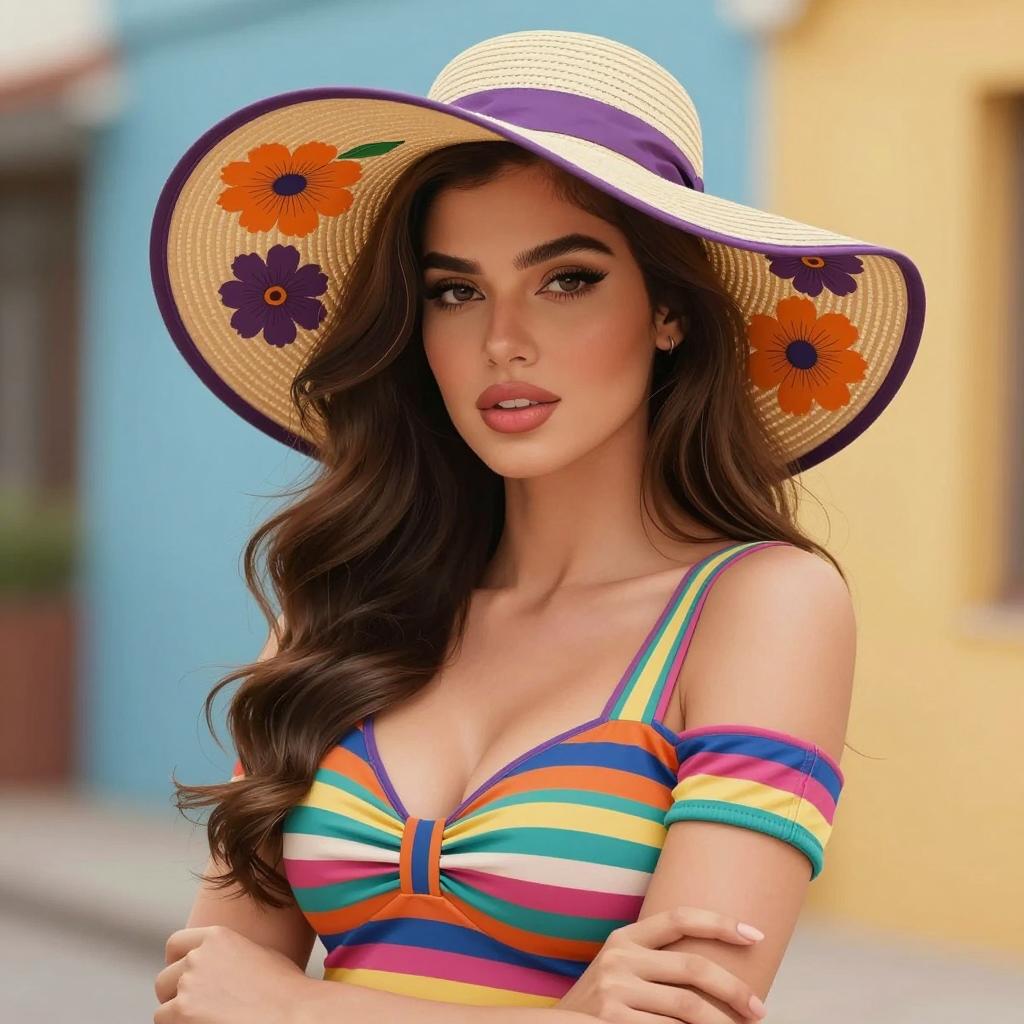 Digital illustration of a woman with long, wavy brown hair wearing a large, colorful sunhat with orange and purple flowers. She has a fair complexion, full lips with pink lipstick, and a confident expression. She wears a tight, colorful striped top with cutout shoulders and a deep neckline, showing cleavage. Her arms are crossed over her chest. The background is blurred, featuring vibrant blue and yellow colors. She has dark, well-defined eyebrows and subtle eye makeup. The illustration style is highly detailed and realistic.