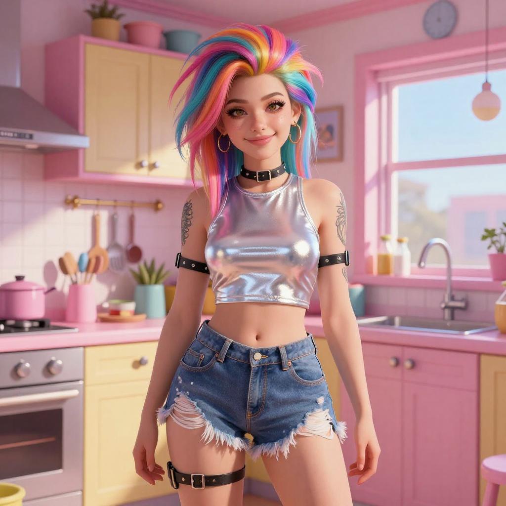 A vibrant, digitally-rendered image of a cute, young woman with multicolored, punk-styled hair standing in a neon-pink kitchen. She's wearing a shiny silver crop top, high-waisted, frayed denim shorts, and black leather straps around her arms and thighs. She has a tattoo on her left upper arm and a confident smile. The background features colorful cabinets, a window, and various kitchen items.