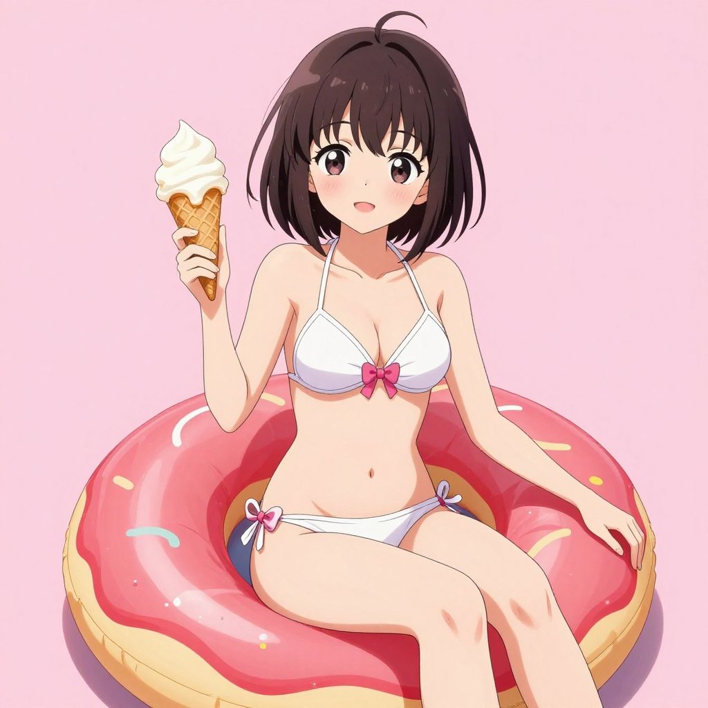 Digital illustration of an anime-style girl with short dark hair wearing a white bikini adorned with bows. She is sitting on a pink donut-shaped float and holding a melting ice cream cone. The background is solid light pink.