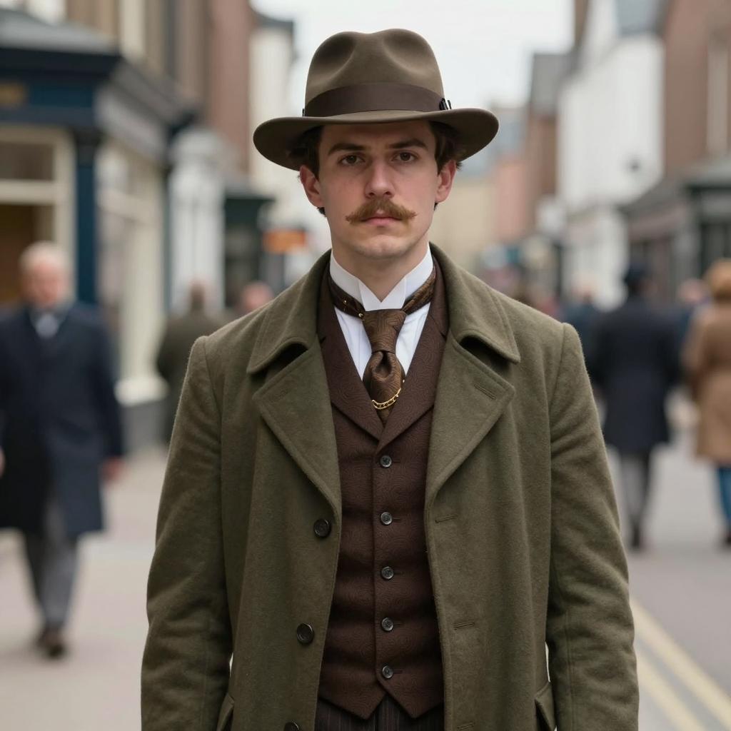 Iconic british duos fancy, photograph of a young white man standing outdoors, wearing vintage Victorian-style clothing, olive green jacket, brown waistcoat, red bowtie, brown trousers, short brown wavy hair, neutral expression, green ivy-covered stone wall background, daytime, natural light, detailed ures on clothing, grass and small plants in foreground, portrait orientation, realistic style, T2I-generated image, historical fashion, period costume