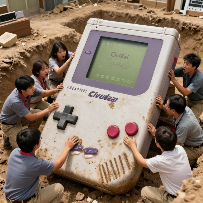 \"Image of a team of archeologists at a dig site, surrounded by dirt and debris, as they uncover a massive, ancient Gameboy, The Gameboy is enormous, at least 100 times larger than a normal Gameboy, and is covered in dirt and grime, The archeologists are amazed and excited by the discovery, and are carefully brushing away the dirt to reveal the Gameboy's details, But to their surprise, as they clean off the dirt, the Gameboy suddenly powers on, and the screen flickers to life, The title screen of the classic Gameboy game \"Civitai\" appears, complete with the iconic Civitai logo and the familiar music, The archeologists are stunned, and are gathered around the Gameboy, marveling at the incredible discovery, Style: realistic, and exciting, with a focus on capturing the surprise and wonder of the archeologists as they uncover this incredible artifact, \" Highest quality
