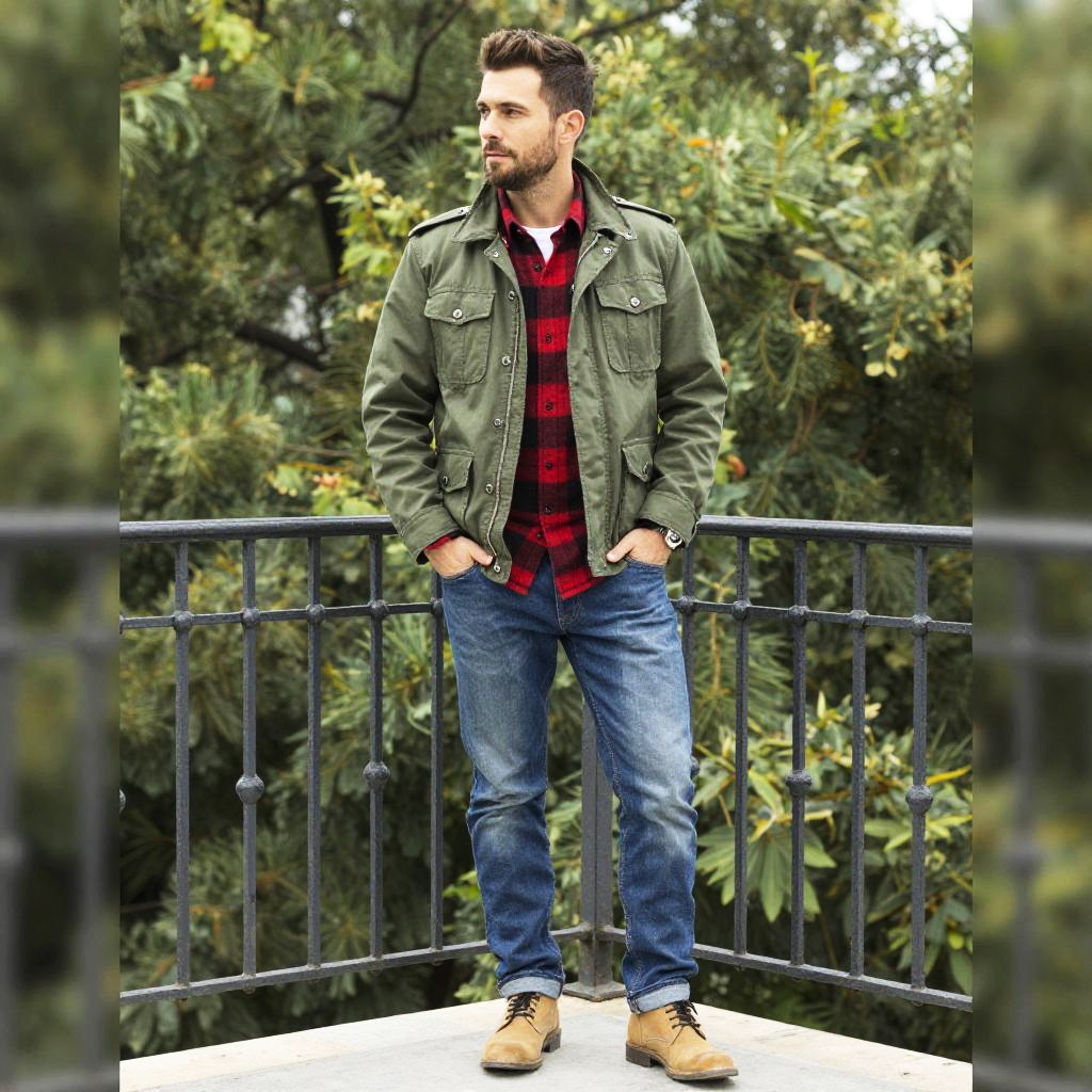 A photograph of a casually stylish man standing on a wrought-iron balcony. He's wearing a green military-style jacket over a red and black plaid shirt, blue jeans, and tan shoes with black laces. He has short, styled brown hair, a trimmed beard, and his hands are casually in his pockets. The background features lush, green foliage. The image has a bright, natural light.