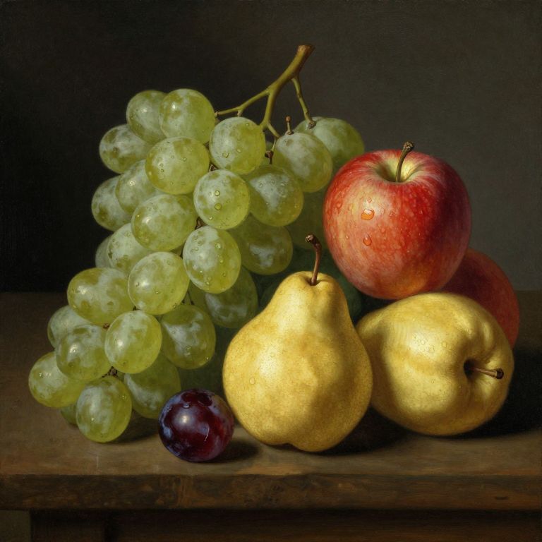 A meticulously crafted still life by Jacob van Walscapelle, featuring vibrant oil painting techniques on panel, showcasing a harmonious arrangement of green grapes, red apples, yellow pears, and plums, illuminated by soft, natural lighting against a dark background, exemplifying the artist's mastery in capturing the textures and colors of fruit in a classic Dutch Baroque style.