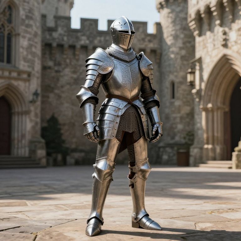 B-epon knight in shining armor standing in a medieval castle courtyard, intricate engravings on armor, morning light casting long shadows, realistic textures on stone and metal, epic heroic pose