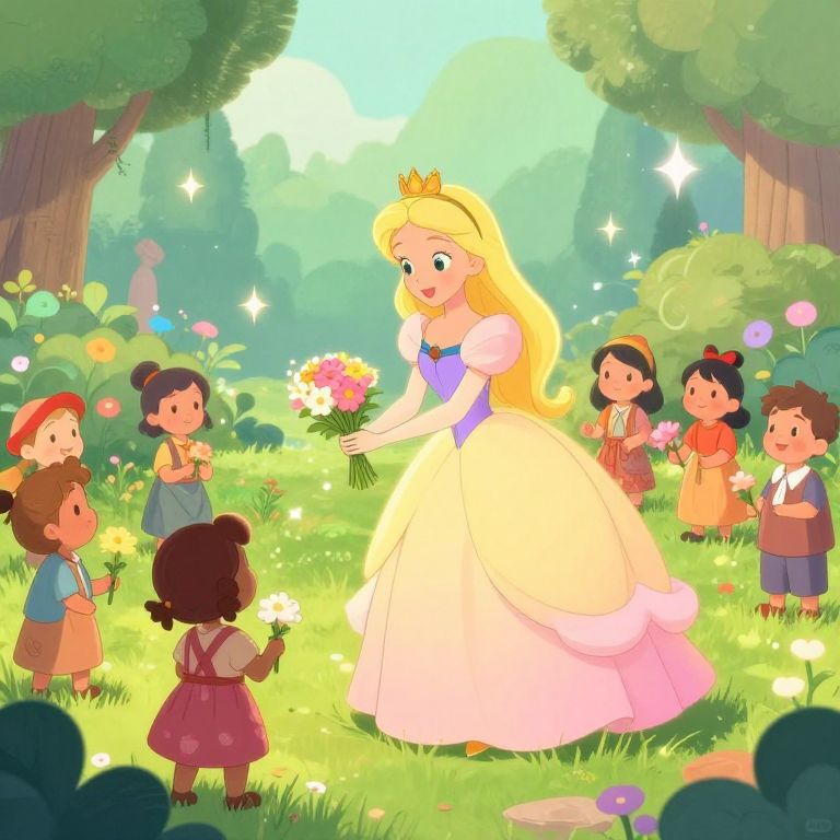 Generous cartoon princess distributing flowers to villagers in a magical garden, pastel colors, whimsical design, lush greenery, sparkling effects, enchanted atmosphere
