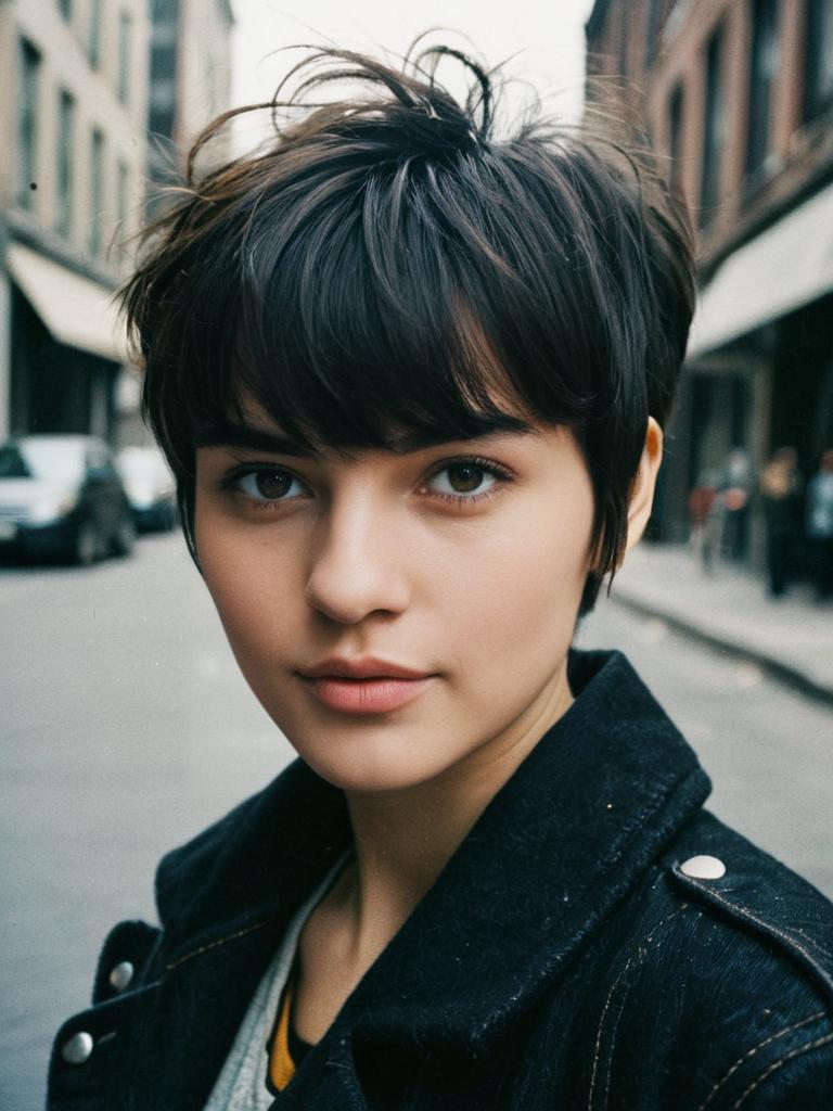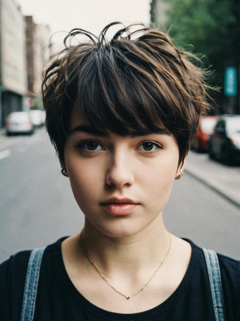 Woman with Messy Pixie Cut and Bangs hairstyle, candid outdoor street portrait
