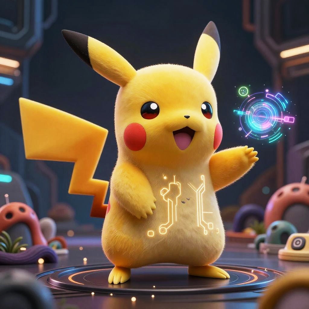 A dynamic CGI image featuring two Pikachu characters with yellow fur and red cheeks, standing in a futuristic cityscape. They are facing two large, white and blue robotic mecha with glowing red eyes and yellow accents. The mecha are positioned on either side, with one firing a bright, explosive beam of light between them. The background shows tall, illuminated skyscrapers and a smoky, dystopian atmosphere. Pikachu holds their signature jagged yellow tails, contrasting with the mecha's sleek, metallic textures. The scene is action-packed, with dramatic lighting and intense energy.