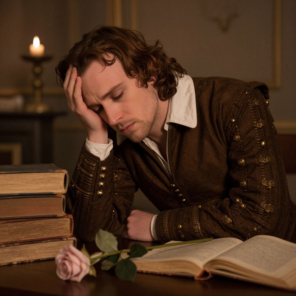 Sad Romeo in a dim candlelit chamber, surrounded by old books and wilted roses, contemplative and heartbroken, dressed in authentic Shakespearean costume, soft shadows and warm tones creating a nostalgic and sorrowful ambiance