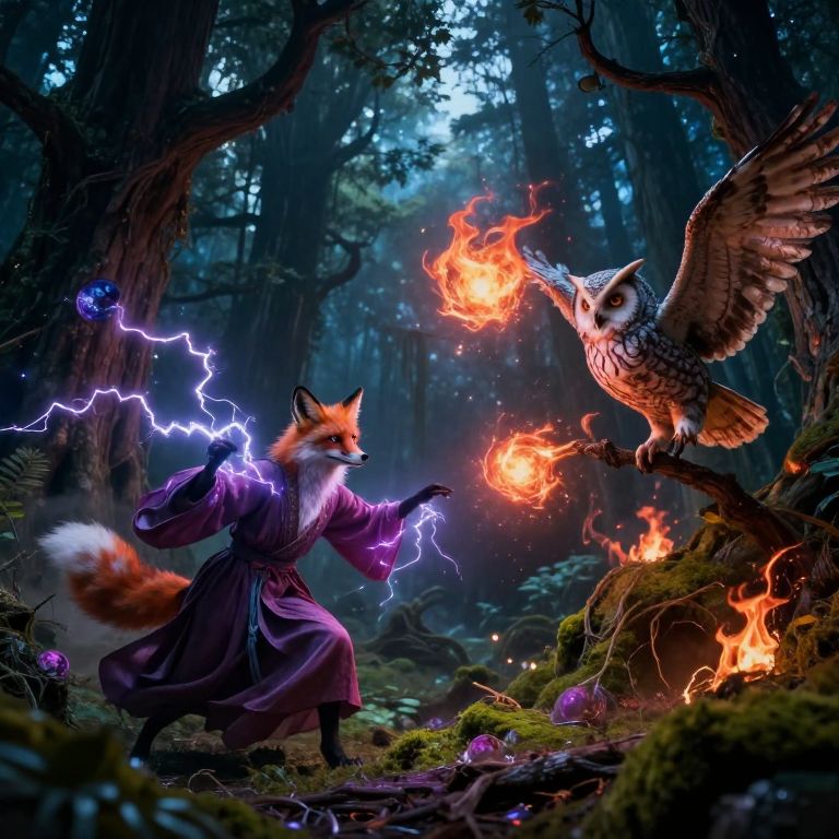 Digital artwork depicting a magical forest scene. A fox-like anthropomorphic character with orange fur, wearing a purple robe, stands on the left, emitting purple lightning from its hands. Opposite, a large owl with detailed feathers hovers, conjuring orange flames. The forest background is dark and dense with tall trees and moss-covered ground. Purple glowing orbs float around, adding to the mystical atmosphere. The scene is dynamic, with intense colors and detailed textures, creating a fantastical and enchanting mood.
