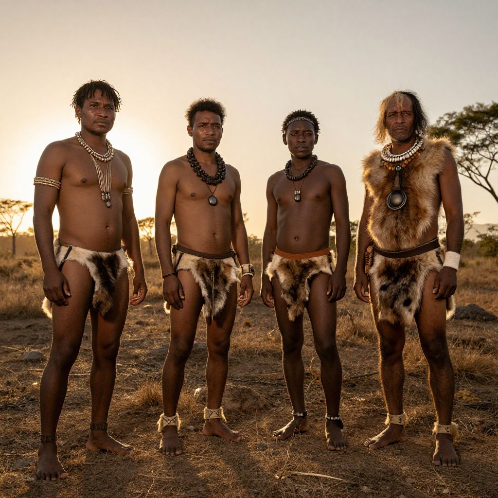 Prehistoric outfits showcased on ancient humans in a rugged wilderness, featuring animal skins, primitive accessories, and natural dyes, capturing the raw and survivalist essence of early human fashion under a golden sunset.