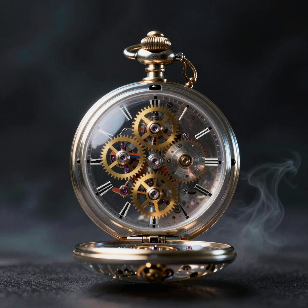 Transparent vintage pocket watch floating in midair against a dark, smoky background, showing intricate inner gears and mechanisms through its glass body, hyper-detailed steampunk aesthetic with a mystical aura.